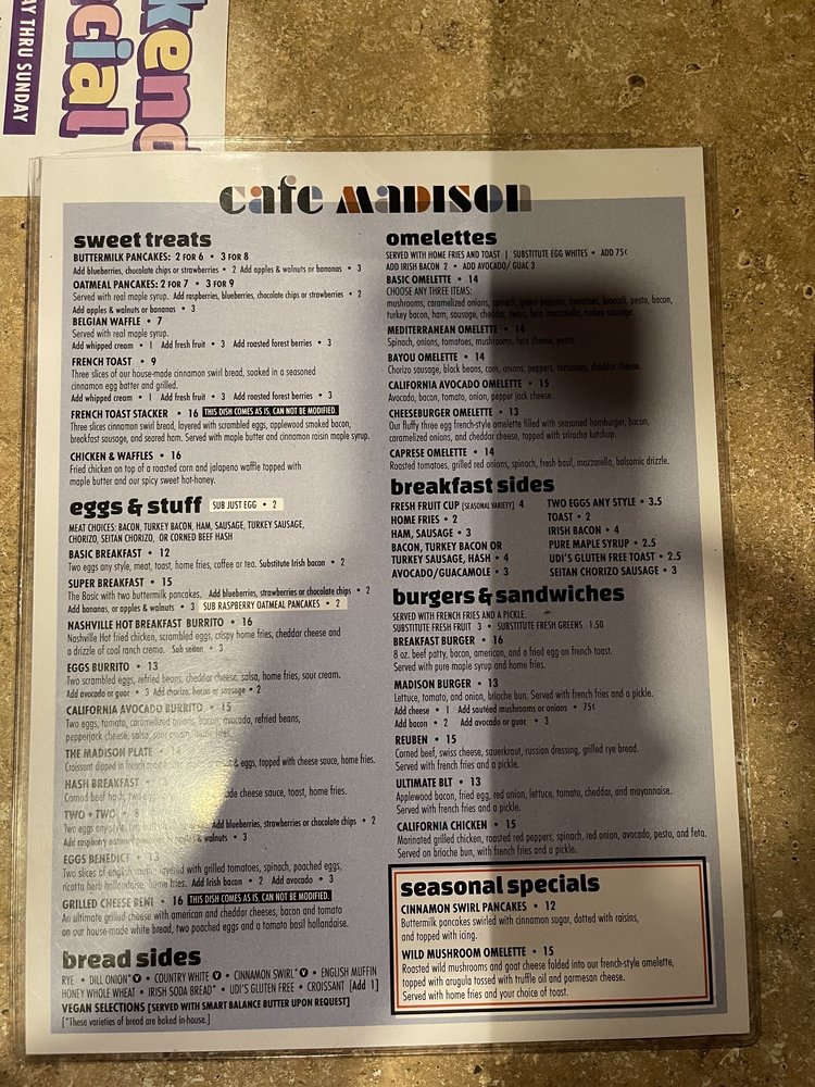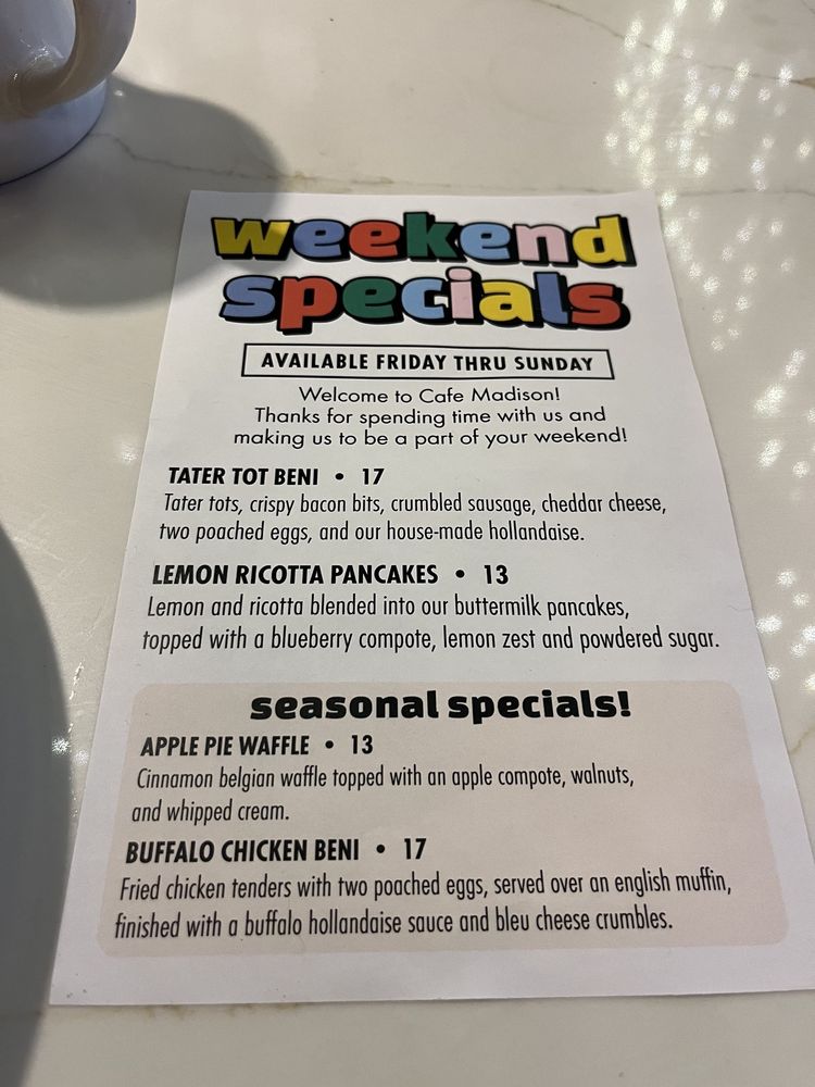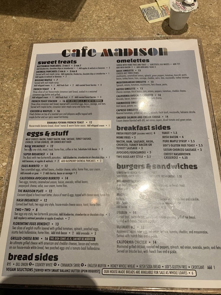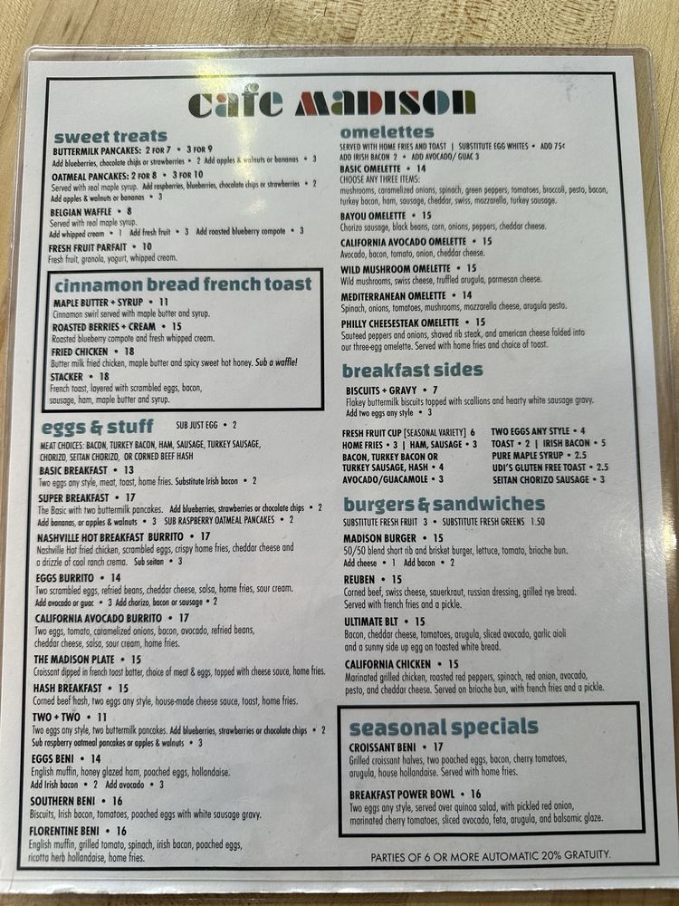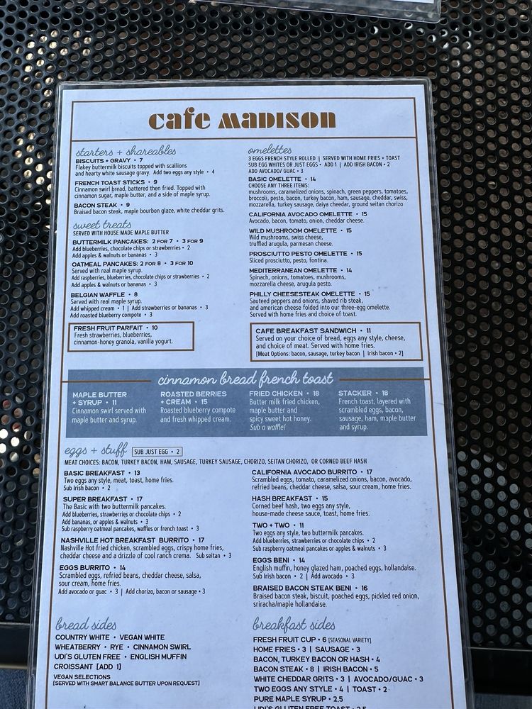Introducing the menu at Cafe Madison, a charming spot in Albany offering a delightful selection of salads, breakfast, brunch, and sandwiches. The restaurant provides a range of amenities like delivery, takeout, reservations, vegan options, and accepts various payment methods including cryptocurrency. With features like outdoor seating, free Wi-Fi, and a full bar, the setting is casual yet inviting. Customers rave about the ambiance and service, with standout dishes including the Biscuits Gravy and French Toast Sticks for starters. Indulge in their Sweet Treats like the Belgian Waffle or Roasted Berries & Cream French Toast for a flavorsome experience. Reviews praise the consistency of the food and the attentive staff, making Cafe Madison a top choice for a satisfying breakfast or brunch in Albany.